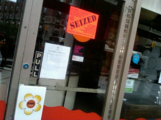 Okay, so there isn’t really a “Sheriff” of the Upper West Side, but the city marshal does seem to be coming to the neighborhood quite a bit lately to slap “Seized” signs on the doors of businesses that can’t keep up with their bills. In the past few weeks, Sushi A-Go-Go at 1900 Broadway between 63rd and 64th Streets, and Brian Deli & Food Plaza on the corner of 67th Street and Amsterdam Avenue have both been shuttered by the marshal.