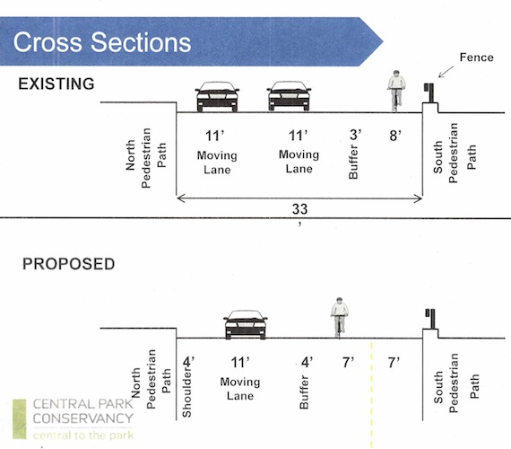 This is the second new East-West bike lane created this year in Central Park. The first is at 96th Street (before this year, there were no dedicated East-West bike lanes in the park). It’s also another step toward a car-free Central Park, a major goal of some bicycling advocates.