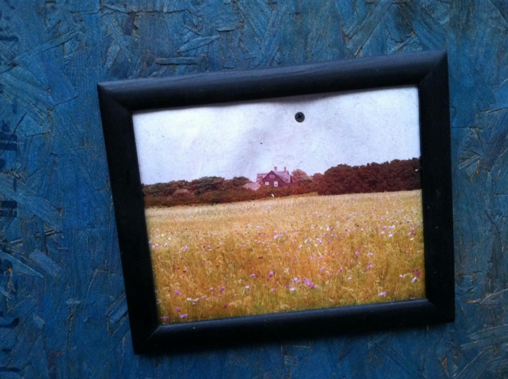 One other funny thing about the store: someone hung a framed photo of a house in the country on the door of the construction site, an idyllic little image in an otherwise ugly space. In some ways, it reminds me of the Upper West Side’s sticker bandit.