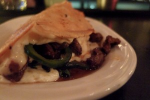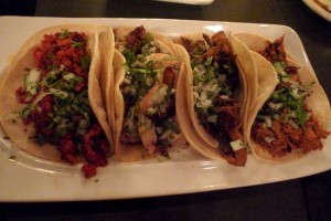 I sampled the octopus, chorizo, lamb, and pork tacos and couldn’t resist the grilled calamari salad and skirt steak quesadillas. Each taco arrived filled to the brim and was ensconced in two tortillas. My favorites were the octopus; delicate, tender chunks of lightly chewy goodness, and the pork, which almost melted in your mouth. The chorizo and lamb tacos were dry. In fact, almost all the tacos, with the exception of the octopus, could use a little more “au jus” or salsa. The double layer tortilla only added to the dryness factor.