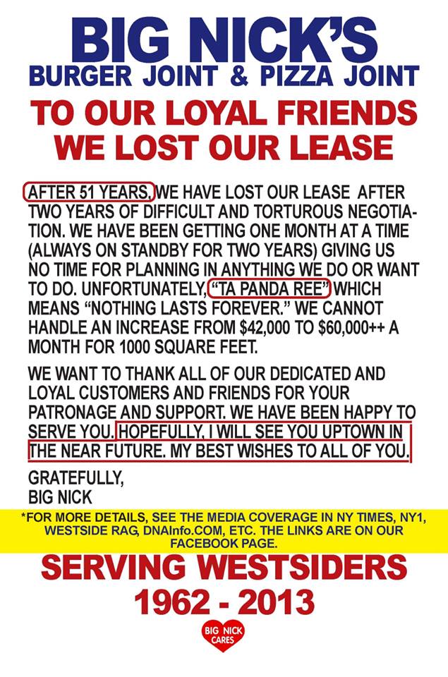 A modern day tragedy. When I first moved to the Upper West Side in 1979 Nick’s was my neighborhood ‘joint’ and has often been a place to take out of towners for fabulous pizza and burgers. I called so often I didn’t need my Pizza Joint magnet… “724.2010 They Deliver” I’m no longer living in the West 70s but have visited often and will keep an eye out for the new location.