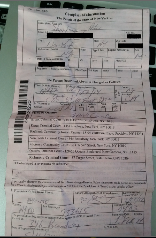 IANAL (I Am Not A Lawyer), but this summons may be defective. Where the officer is required to print their full name, they only provided their last name. I’ve had parking summonses dismissed for the complainant’s name being illegible or incomplete. At the very least, this would give a judge a reason to dismiss the summons if they’re inclined to do so based on the circumstances, even though the letter of the law was violated.