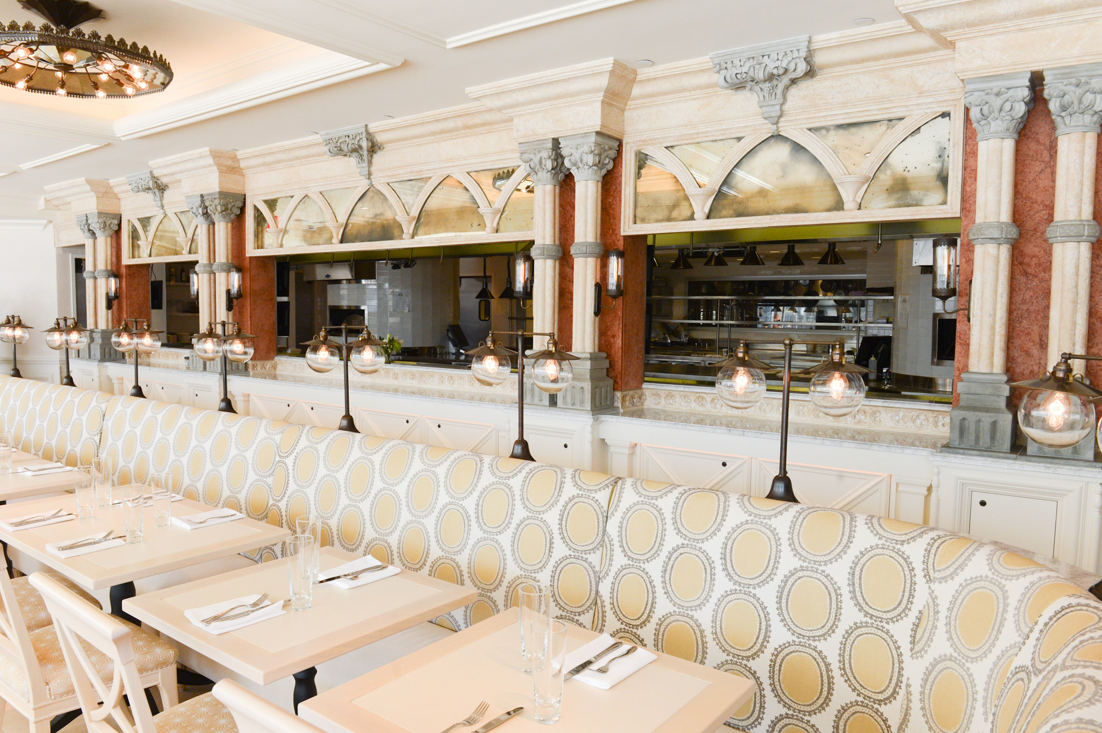 The decor is ugly. The hanging light fixtures are hideous. The endless, ugly green tufted bench just borders and dominates the space. They then added opaque panels above that bench -the view of the park is blocked.