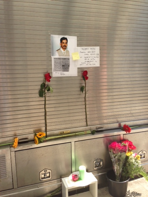 Patel has two children, ages 3 and 7, according to his cousin who was working at the newsstand on Wednesday. After we inquired about making donations, he said that some people had already given money and that the best way to give would be to write a check. Patel’s picture is pasted to the side of the newsstand along with the Daily News article. His funeral was held on Tuesday and some people have put flowers in front of the newsstand.
