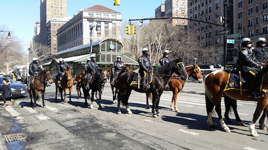 Harriet Flehinger sent in the photo above of police horses at the intersection of 72nd street and Broadway at noon on Wednesday, bringing to mind the great old Westerns of yesteryear: “Let’s form a posse!”