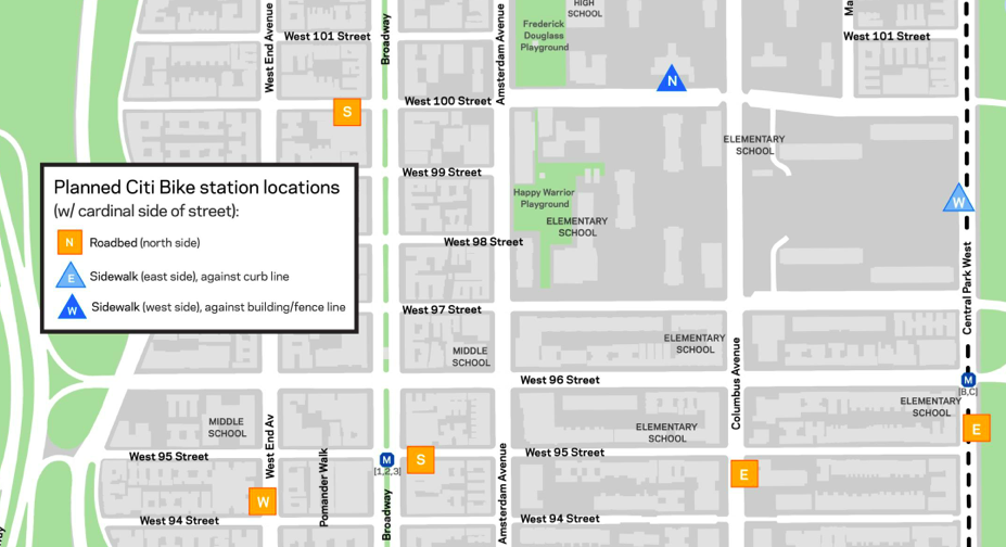 — Some people want a station or two on 97th between Columbus and Amsterdam. That’s a wide block but it presents some challenges: some neighbors are calling for new public amenities and seating, and others are fighting a proposal for a new nursing home. Nonetheless, several community members called for a station or two — perhaps near Whole Foods at 97th and Columbus.