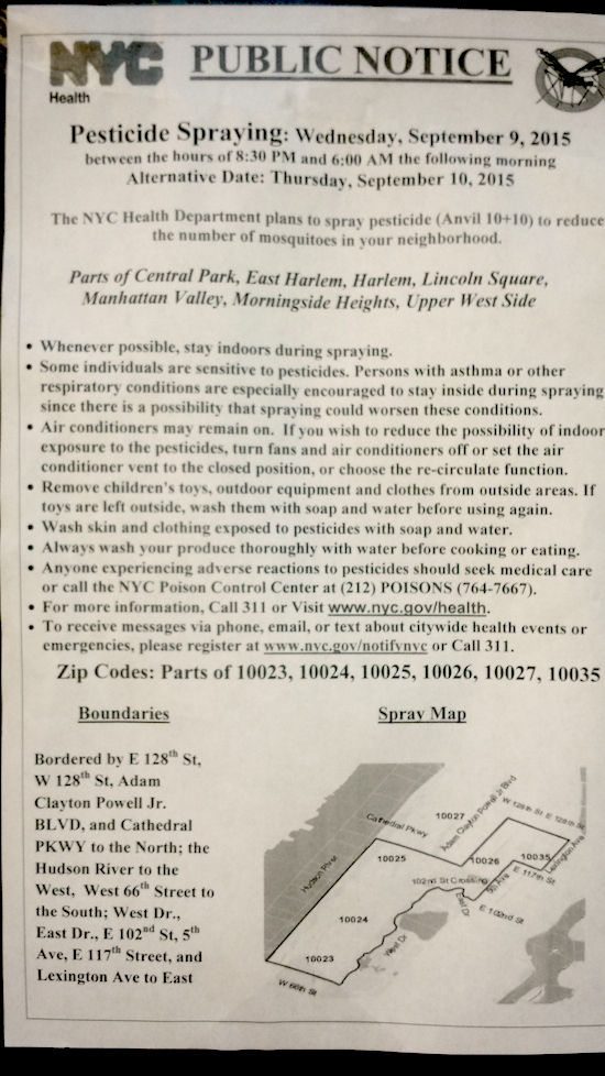 The city plans to spray a pesticide throughout the neighborhood starting Wednesday night “to reduce mosquito activity and the risk of West Nile virus.” The spraying will take place from West 66th street up into Harlem between 8:30 p.m. Wednesday and 6 a.m. Thursday.