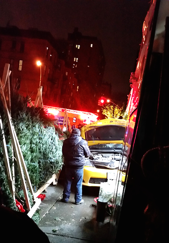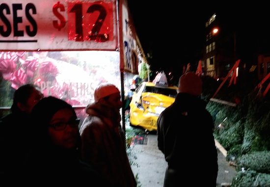 A taxicab careened into a grocery store’s flower stand at 83rd street and Amsterdam Avenue on Monday night around 10 p.m., hitting and injuring a worker there. West Side Rag correspondent Meredith Kurz was at the scene, and sent the description below and the photos. Witnesses said a truck hit the cab, which had no passengers in it, forcing the cab onto the sidewalk.
