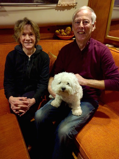 Regina Jordan, Ed Bacon and Ollie inside their boat.