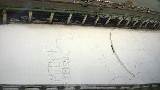 Some dedicated person or people stamped out a message in the snow in Riverside Park around 63rd street wishing someone named Michael a Happy Birthday in Chinese. It appears the author’s name is James or Jay, or perhaps James and Jay created it together. Thanks to Lee Ping Kwan for the photos and translation.