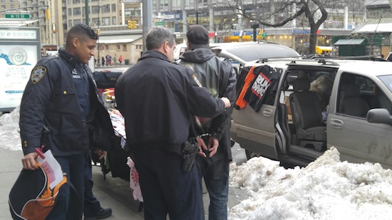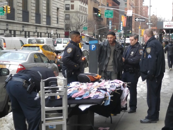 Police arrested a man who had set up a stand to sell clothing on Amsterdam Avenue between 72nd and 73rd streets on Friday around 4:10 p.m., Joseph Bolanos tells us. Bolanos took the photos above and below and an officer told him the arrest was for unlicensed peddling. The 20th precinct did not respond to requests for more information; hopefully we’ll hear more on Tuesday.