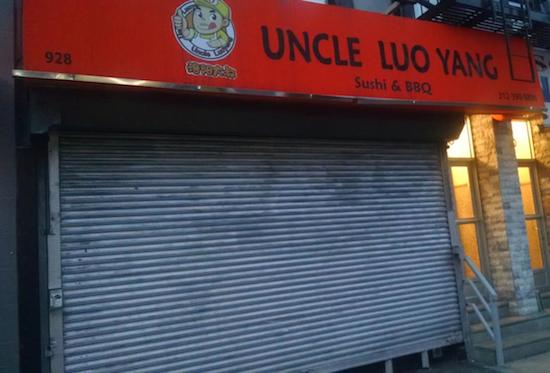 Uncle Luo Yang, a Chinese restaurant on Amsterdam Avenue near 106th street owned by the proprietor of a popular food truck near Columbia, has been closed for months. It was shuttered by the Health Department at the end of October. “This location at 928 Amsterdam Ave, has had the gate down for three months,” wrote Tsadik Kaplan, who sent the photo. “For the first two months, there was a notice on the gate ‘temporarily closed due to renovating the kitchen, will re-open soon’, but for the last month that notice has been missing.”