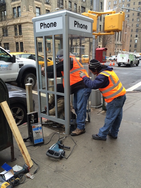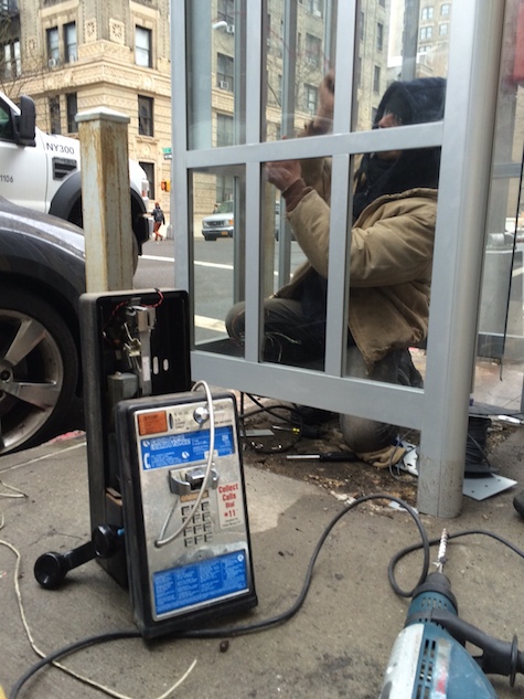 CityBridge, the company that is upgrading more than 7,500 New York phone kiosks with wifi, was removing the phone booth (different from kiosks because they are full boxes with doors) on West End Avenue and 101st street on Wednesday when Ernie Fritz walked by and snapped these photos. Scott Goldsmith, the president of Intersection, a company that’s installing the wifi, told Ernie that they would also be replacing the other three remaining phone booths, all of which are on the Upper West Side. The blog Scouting NY reported in 2009 that, other than the one on 101st, there were also booths on 100th, 90th and 66th, all on West End. And those were the only ones left in Manhattan