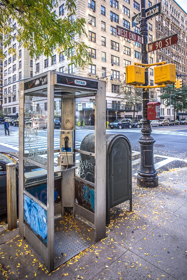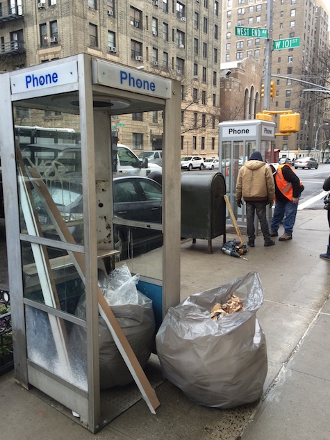 Workers are dismantling the four remaining phone booths on West End Avenue — the four remaining booths in the entire city — and replacing them with shiny new phone booths.