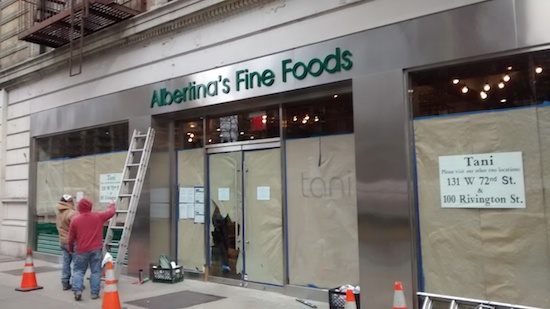A new market called Albertina’s Fine Foods is setting up shop in the old Tani’s shoe store space on Broadway between 69th and 70th streets. We had heard several months ago that it would be a deli. Information about the store is scarce so far. Thanks to Maria, Gretchen and several others for the tips.