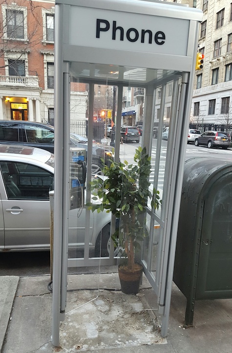 Someone spruced up one of the new phone booths at 90th street and West End Avenue with a potted plant. Photo by Elizabeth Isakson.