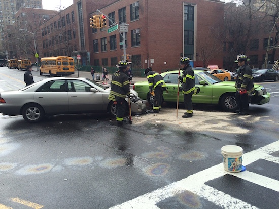 A sedan and a taxicab collided in the middle of the intersection of 96th street and West End Avenue shortly after noon on Monday, and two people were taken to the hospital with injuries. The FDNY got the call at 12:27, a spokesperson said.