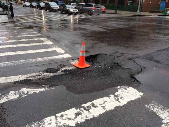 The intersection of 96th street and West End Avenue has had a troubling tendency to sink into the soft underbelly of New York City in the past couple of weeks. While city workers had seemed to have patched the problem last weekend, it reemerged on Saturday (the new hole appears to be in a slightly different spot than the old one).