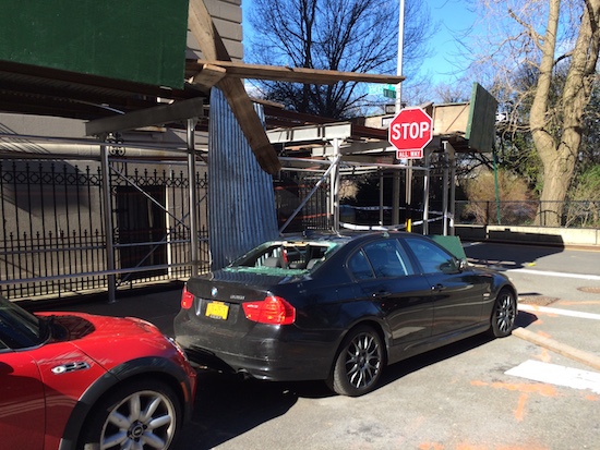 The winds were nasty overnight from Saturday night through Sunday morning, with gusts of up to 60 mph expected. Ernie Fritz, who took the picture above, reported that “winds knocked out a side portion of a scaffolding at a building doing renovations on the corner of a building at 103rd and Riverside Drive. There appeared to be no injuries. The fire department was on scene trying to secure the site.”