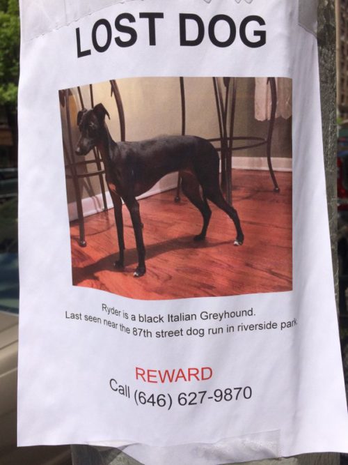 Saw this poor pup running out of riverside park on Sat night toward west end and 88th.. My husband and I tried chasing after him for 2 blocks but he was way quicker. He ran up toward 90th and west end.