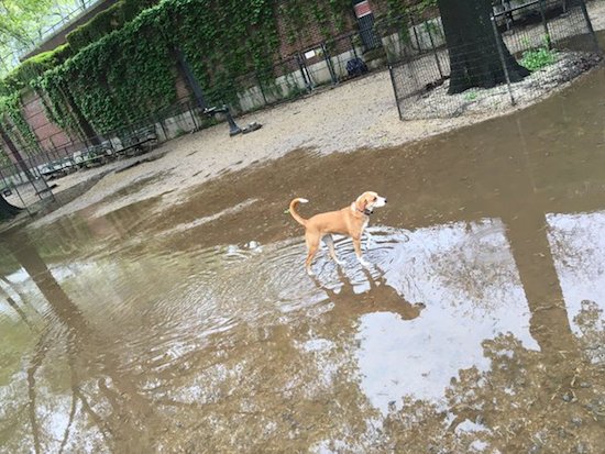 A dog contemplates whether to run or swim at the dog run in Teddy Roosevelt Park. Photo by Rachel.