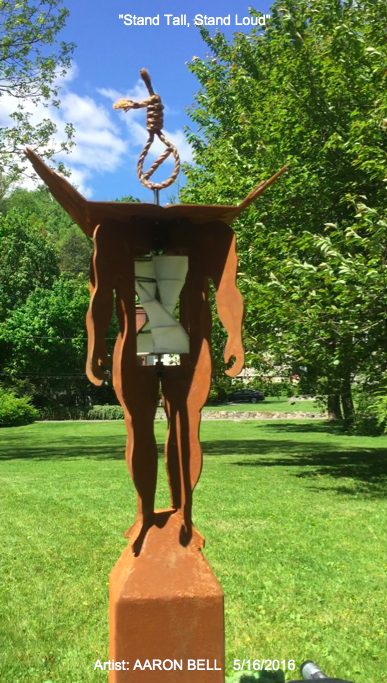 Aaron Bell, a soft-spoken older black artist, crafted a sculpture called “Stand Tall, Stand Loud” based on a quote by Martin Luther King. The metal figure depicted in the sculpture has a noose in place of a head, and the noose has a diagonal line through it (indicating something that is banned, as depicted at right). In a written statement about the piece, Bell explained that the noose “is the embodiment of all forms of hate found in society. Hatred directed towards LGBT communities, religious communities, racial and ethnic communities. Hatred manifested by corrupt members of police departments and corrupt governments as well as hatred manifested by bullies and egocentric politicians.”