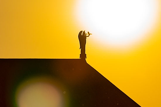 Scott documents this phenomenon every year. And this year, he got to take a picture of a special guest. A bird, which Scott said appeared to be a hawk, landed right on Gabriel’s horn as the sun rose. This would not be the first time a hawk perched on the horn.