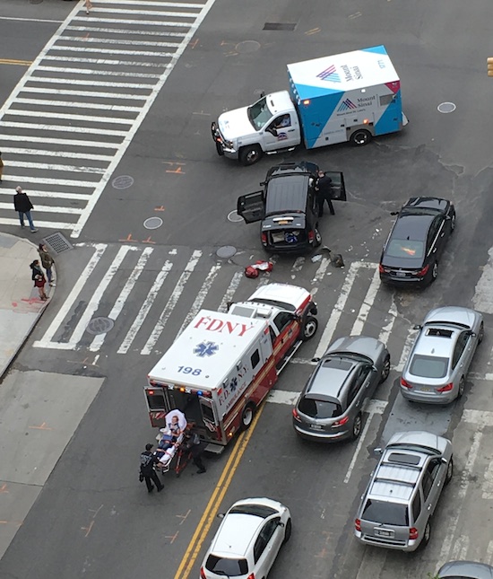Hey, this occurred when an Uber (the black SUV) taking parents and siblings and friends to a law school graduation party was making a legal left turn with 6 people in the car. It was legally in the middle of the intersection slowly turning left when a taxi that had come off the highway and rear-ended another car at that red light, tried to flee the scene by crossing the double yellow, side-swiping another car and then went faster to speed away running the red light and careened into our right back tire. The impact was so intense it turned the car around and the right-side air bags deployed. All 6 passengers were injured and taken to the hospital. We are all okay now. Much appreciation to the good Samaritans, the NYPD, and the ambulance/medics/doctors/nurses. We are all okay with recoverable injuries and have been told that the drivers are okay as well.