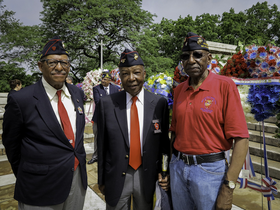 Photo by Aris Dervis of three marines at Monday’s Memorial Day ceremony in Riverside Park. See more photos below.