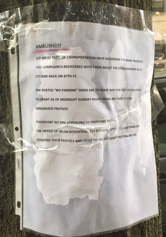 That didn’t take long! Motivate, the owner of Citi Bike, began installing the new bike docks in the neighborhood on Monday. But already there’s a protest at 87th Street and West End Avenue, where a dock was just set up. As you can see, someone believes there was an “AMBUSH!!!!” (Emphasis theirs)