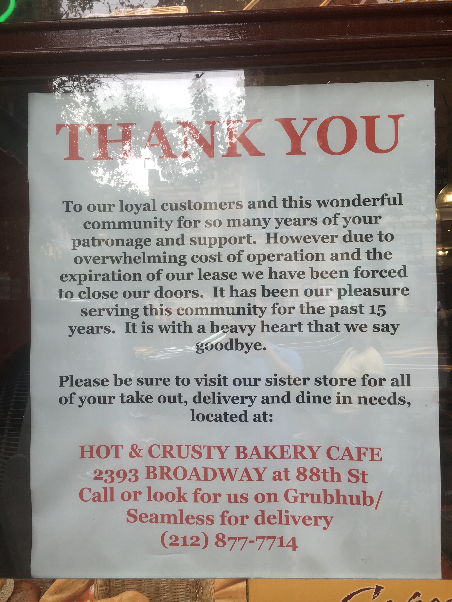 Europan Cafe on the West side of Broadway between 93rd and 94th Street is closing after 15 years, citing increasing costs and the expiration of its lease. Here’s a close-up of their farewell sign. Thanks to Paul, Ruby, Ellen and others for the tips.
