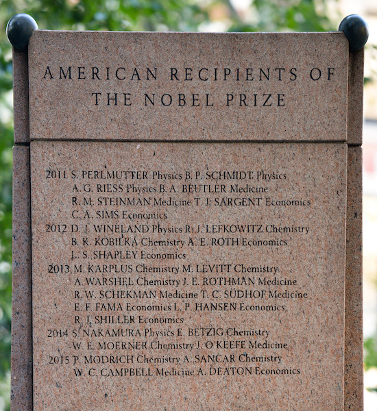 The names of the 2015 Nobel Prize winners were just inscribed on the Nobel Monument in Theodore Roosevelt Park outside the Natural Museum of History.