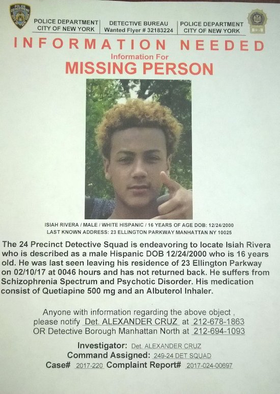 Police are looking for 16-year-old Isaiah Rivera, who suffers from schizophrenia spectrum and psychotic disorder. He was last seen leaving his residence at 23 Ellington Parkway (106th Street) on February 10, a Friday.
