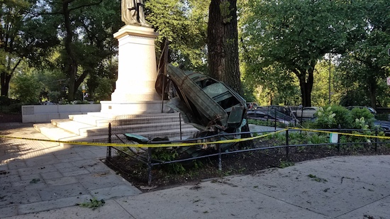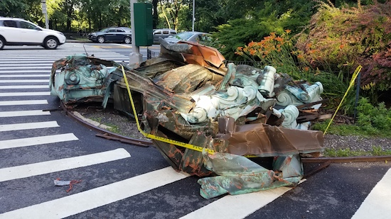 Damage caused to trees and shrubbery by high winds and the falling cornice had been almost entirely cleaned up by Tuesday. It appeared to be sheet metal, wrote Mathew Perlman, who sent in the photos below. Perlman wrote that the photogenic building has been used for various TV shows, and they were recently filming the Amazon show The Marvelous Mrs. Maisel there.
