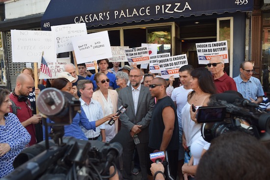 Last week, Upper West Side community members gathered in front of Caesar’s Palace Pizza, which just closed after 36 years due to a rent hike. The event, organized by City Council candidate Mel Wymore, was formed to rally around Caesar’s owner Dimitri Vezyrakis, who’s known as Jimmy by his customers. Raymond Vasquez, Jimmy’s longtime friend, ended the press conference with that line, and the same sentiment dominated the event.