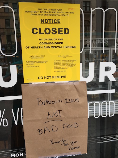 Blossom Du Jour, the vegan “fast food” restaurant at 449 Amsterdam Avenue between 81st and 82nd, was forced to close its doors. Along with the telltale yellow sticker from the Health Department, the restaurant added a note that the problem wasn’t the food, it was the bathroom.