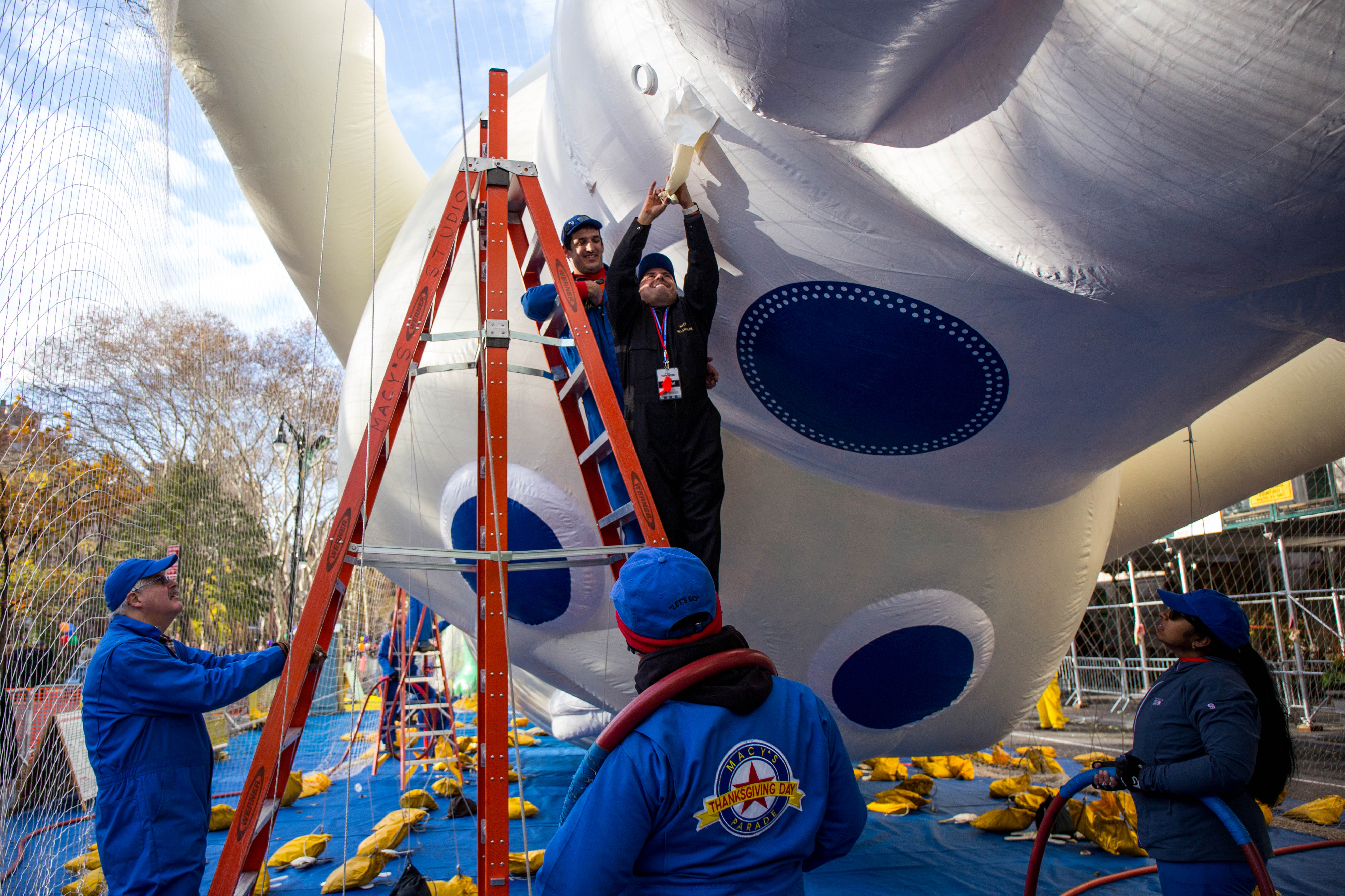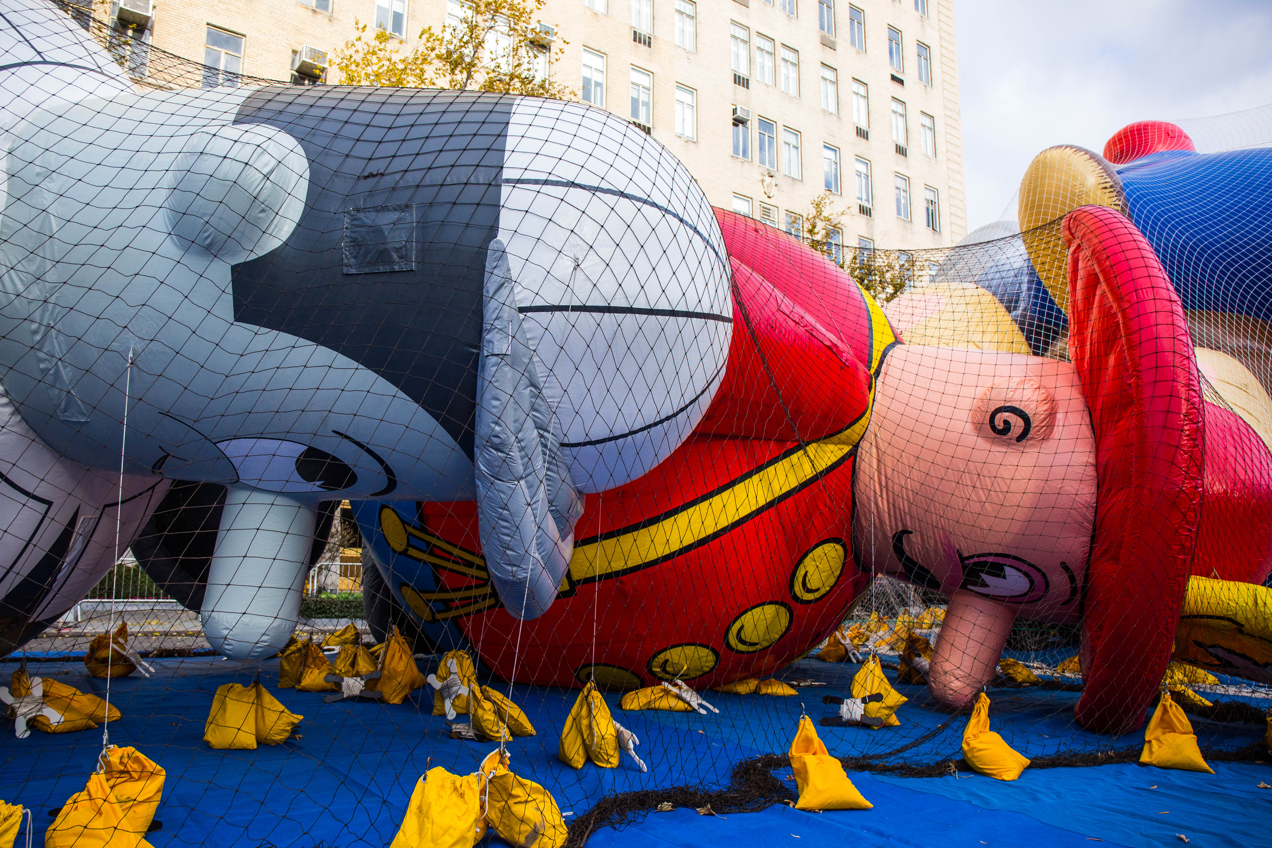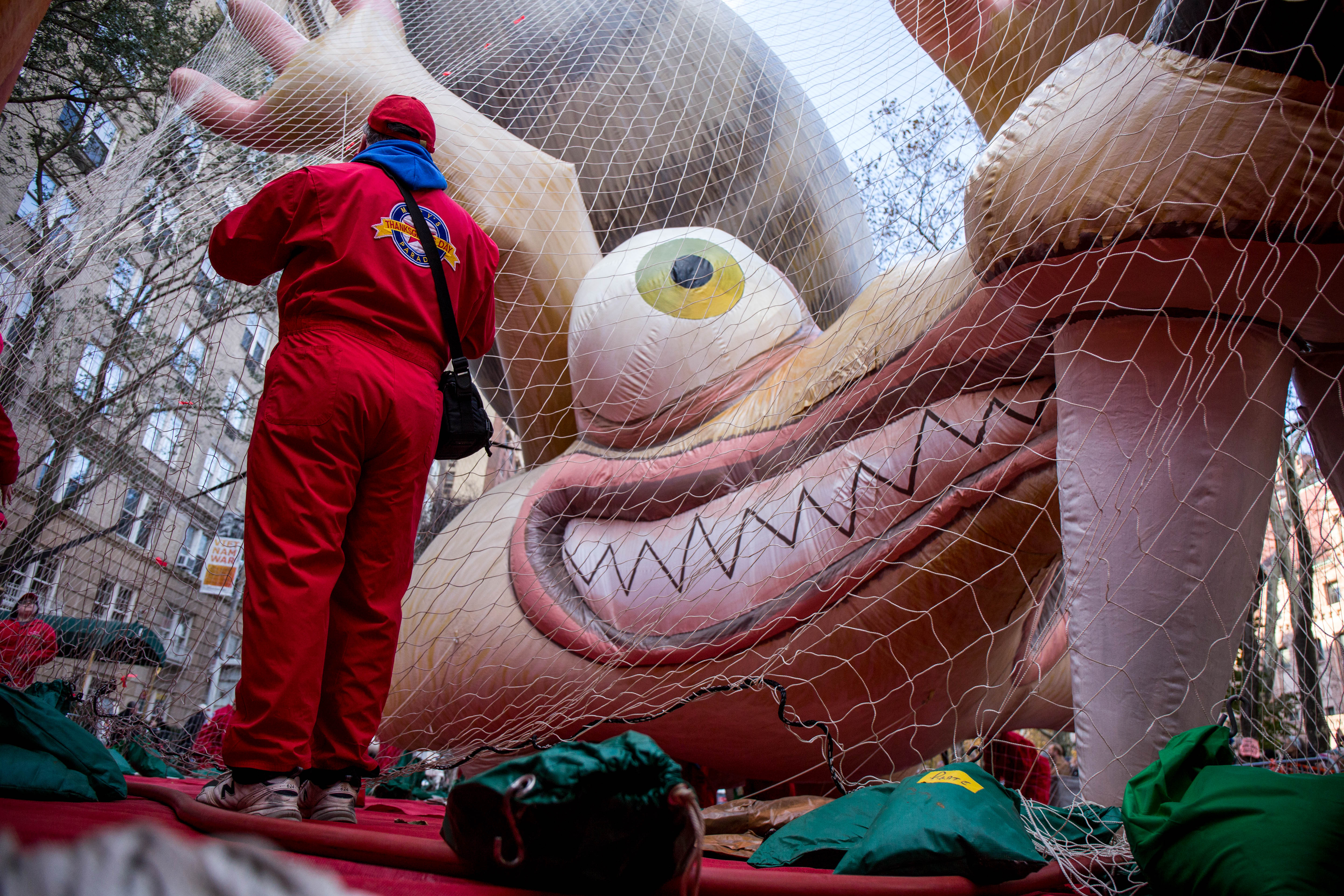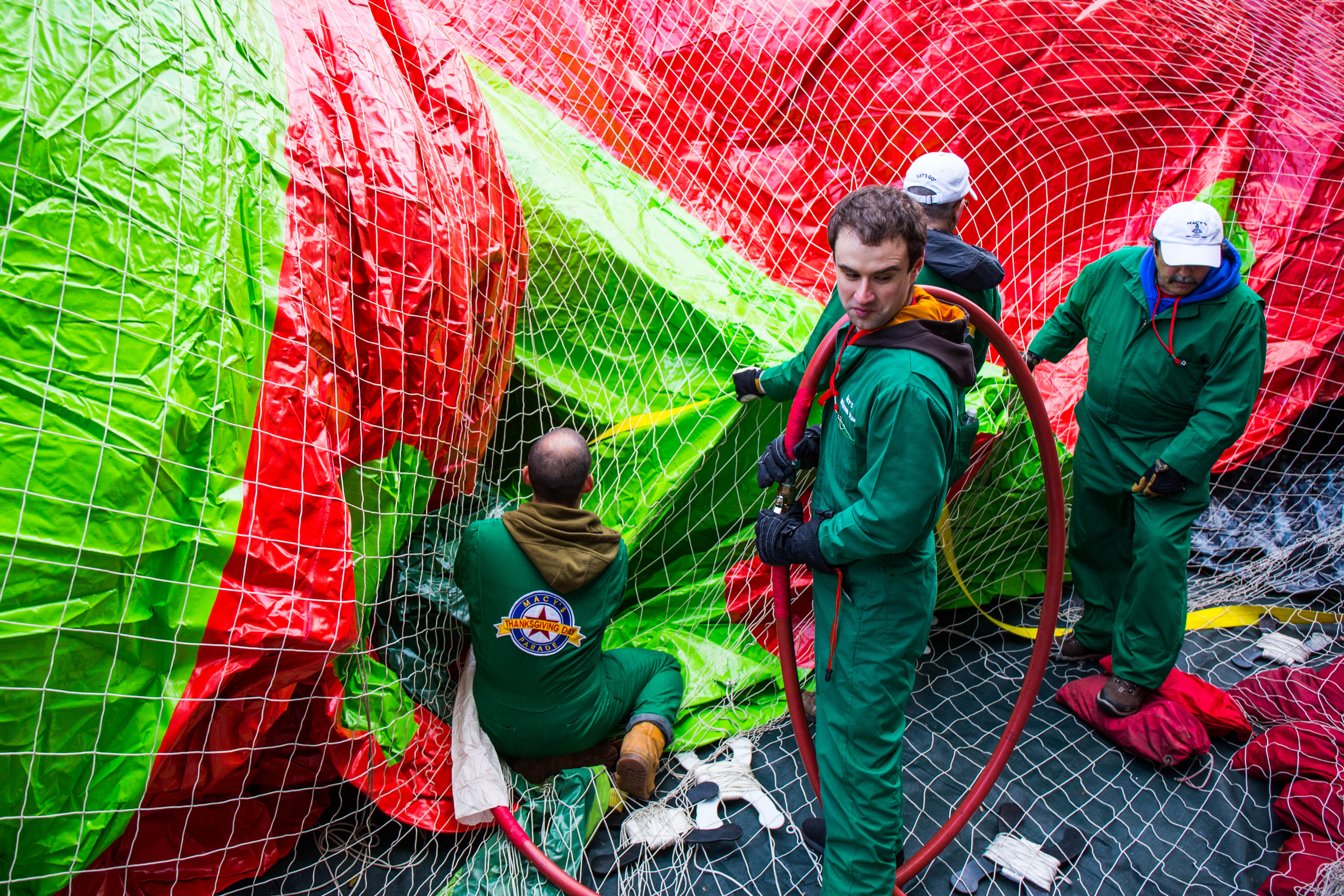 This is a huge undertaking. According to Macy’s Studio Vice President John Piper, the crew of more than a hundred inflation technicians spend all day laying out the balloons on West 77th and 81st Streets, and then blasting them full of helium from one of four gas-tank trailers. Empty, these monsters weigh between 400 and 700 pounds; once full that drops to around NEGATIVE 350 pounds.
