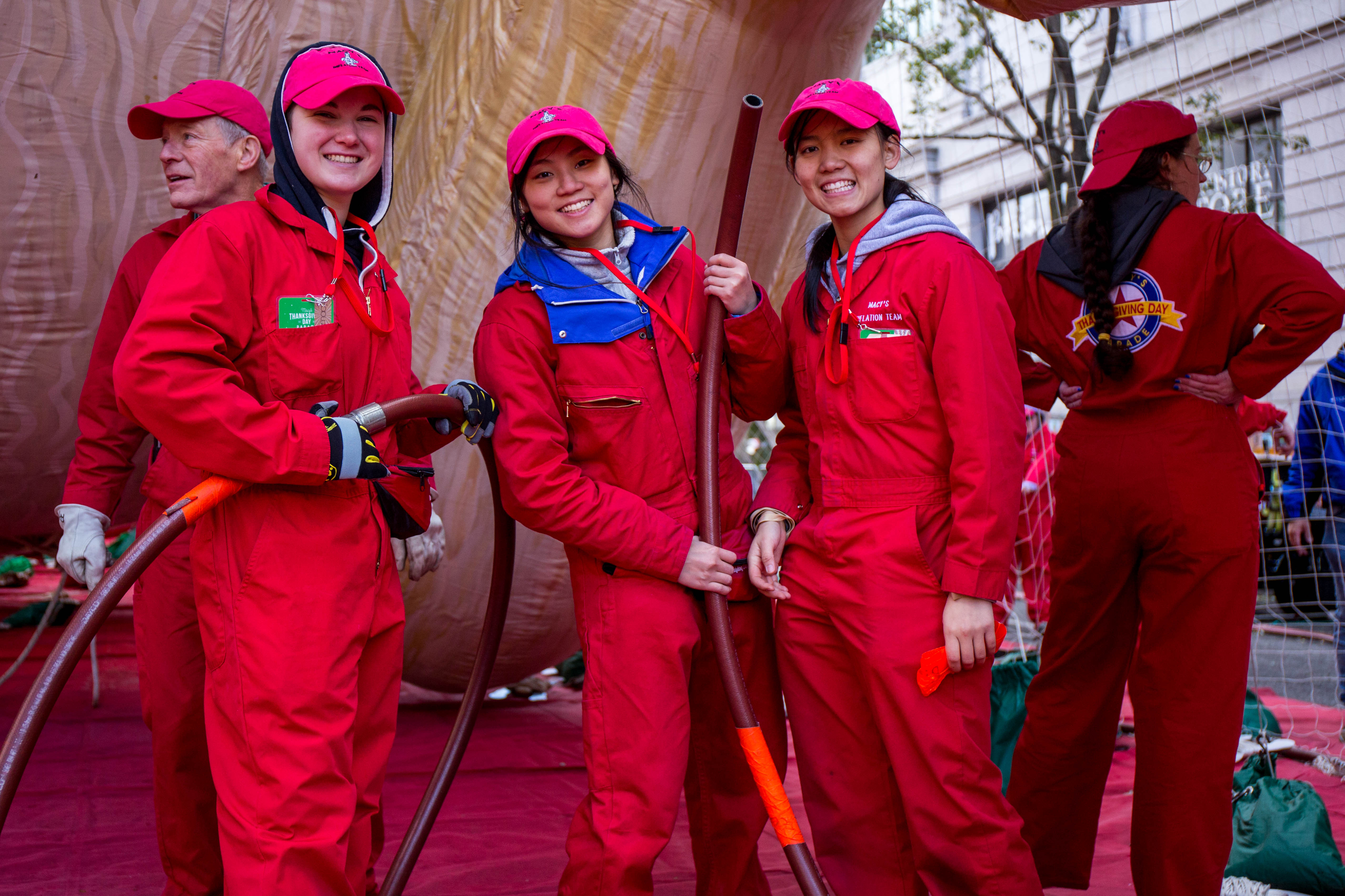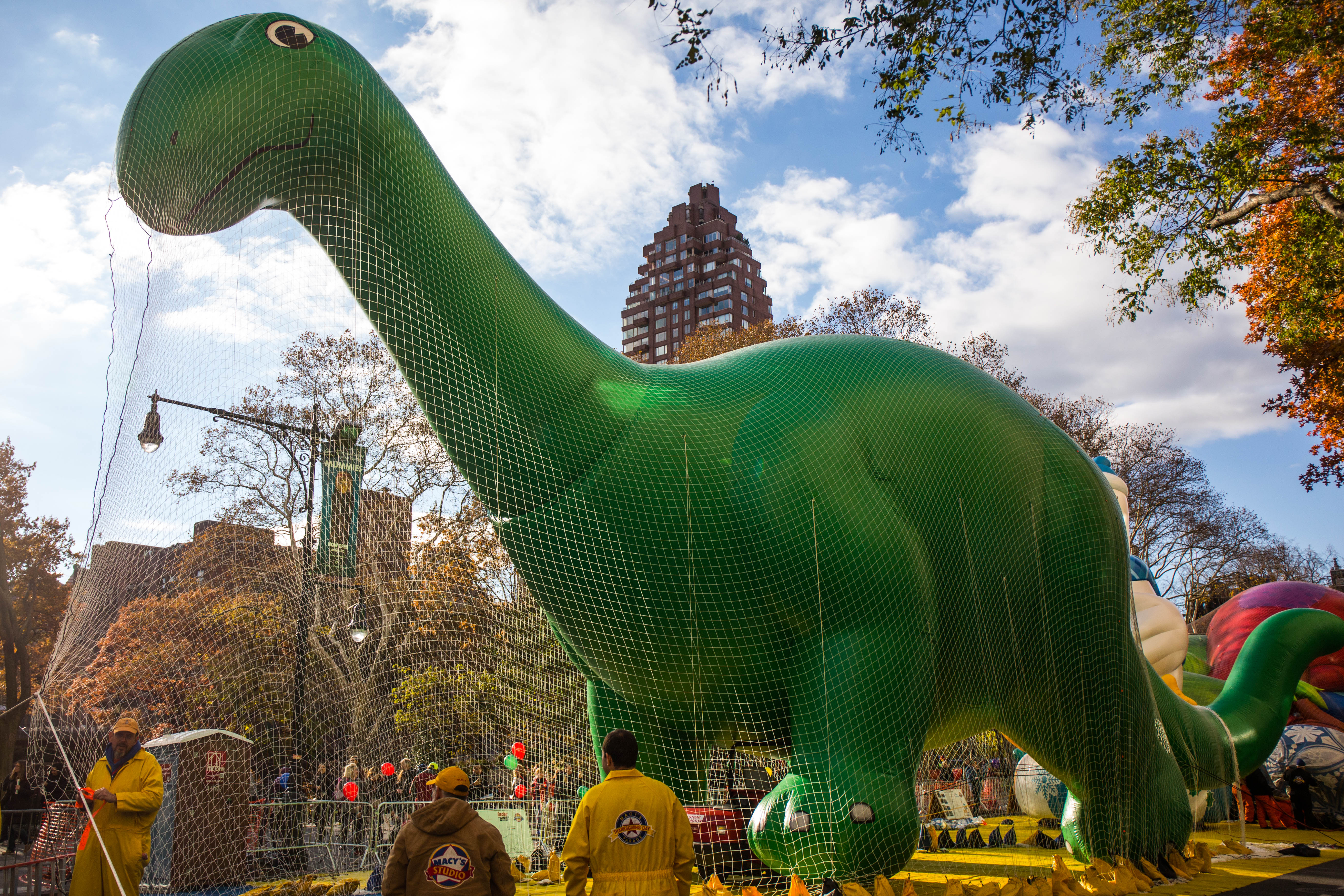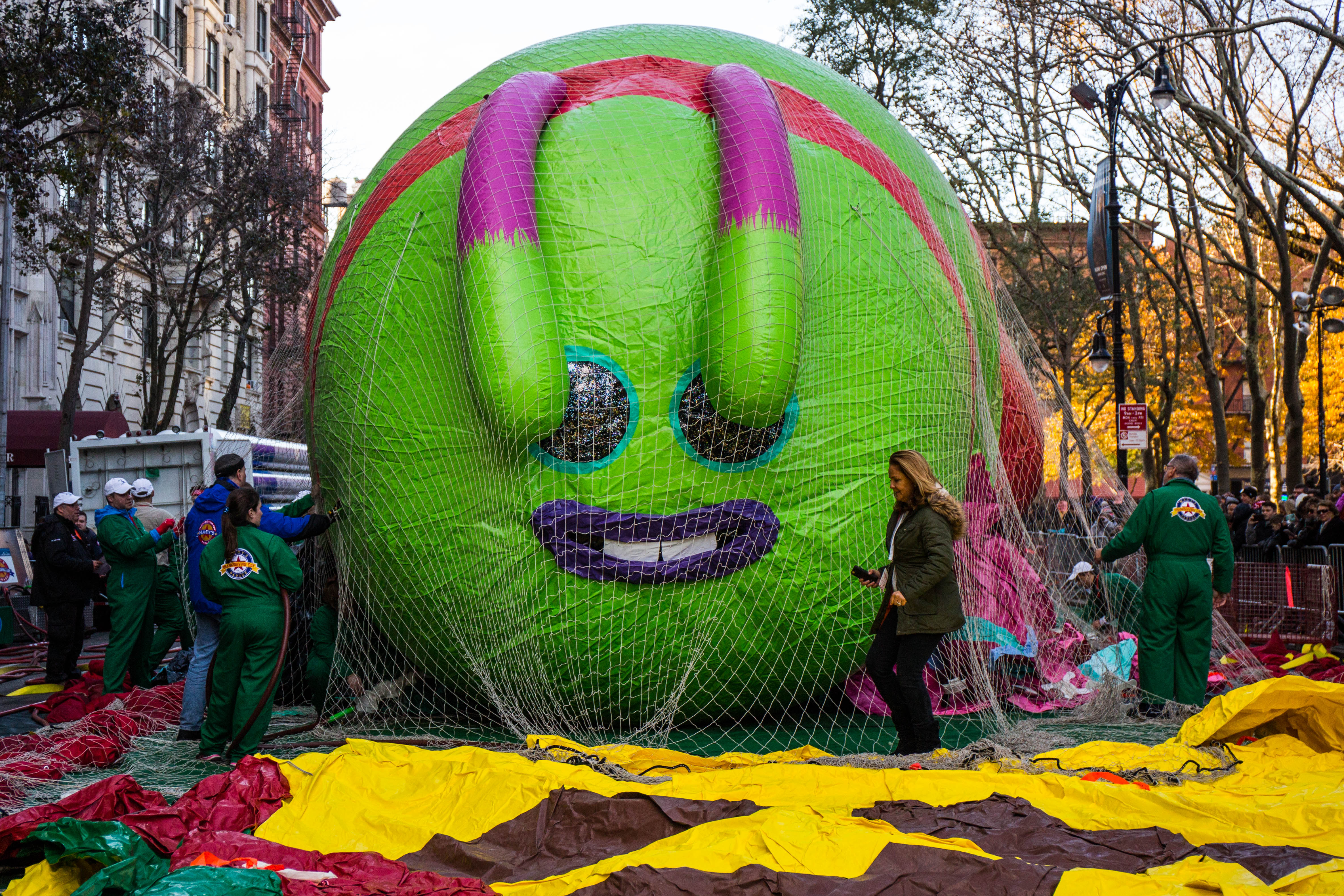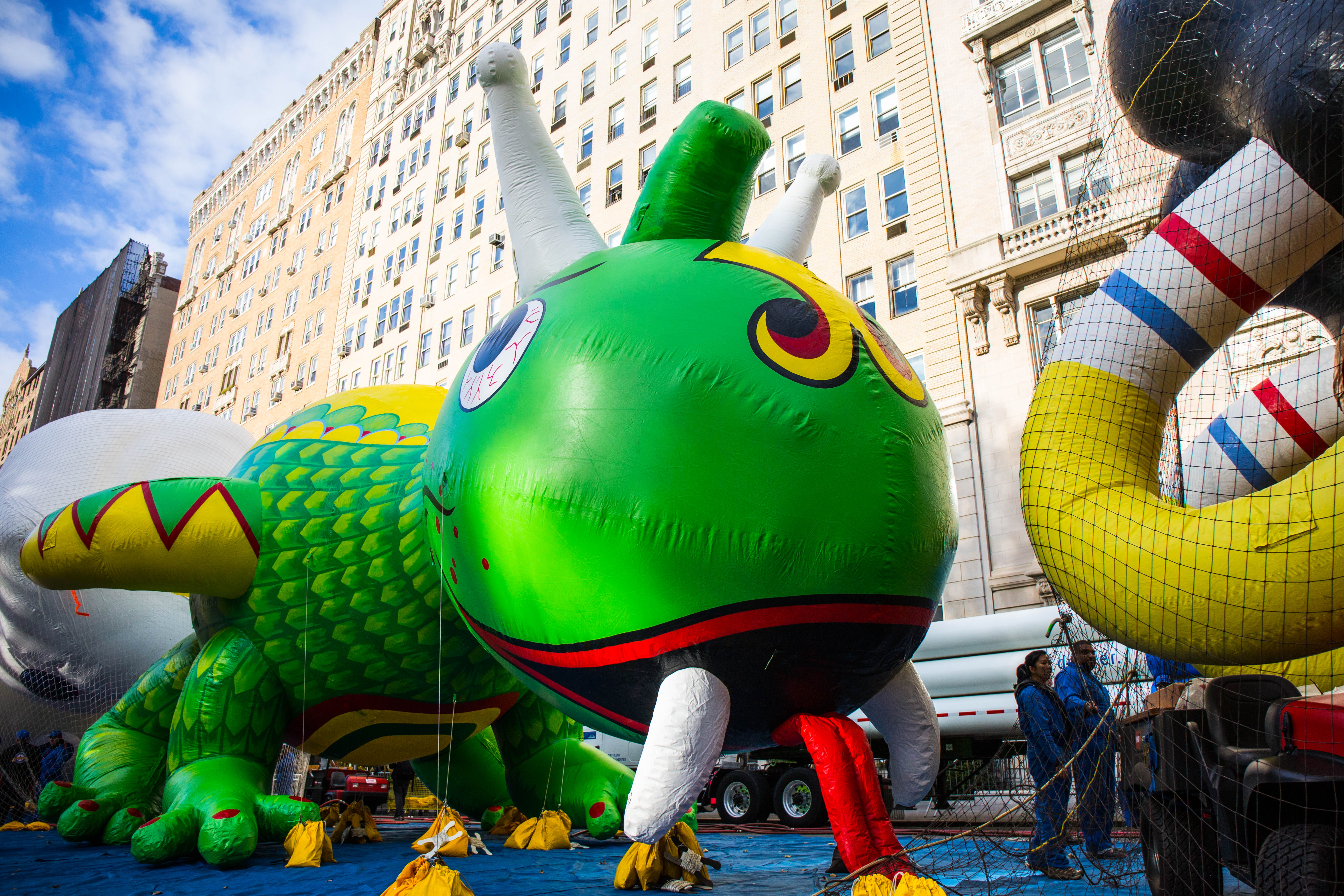 This is a huge undertaking. According to Macy’s Studio Vice President John Piper, the crew of more than a hundred inflation technicians spend all day laying out the balloons on West 77th and 81st Streets, and then blasting them full of helium from one of four gas-tank trailers. Empty, these monsters weigh between 400 and 700 pounds; once full that drops to around NEGATIVE 350 pounds.