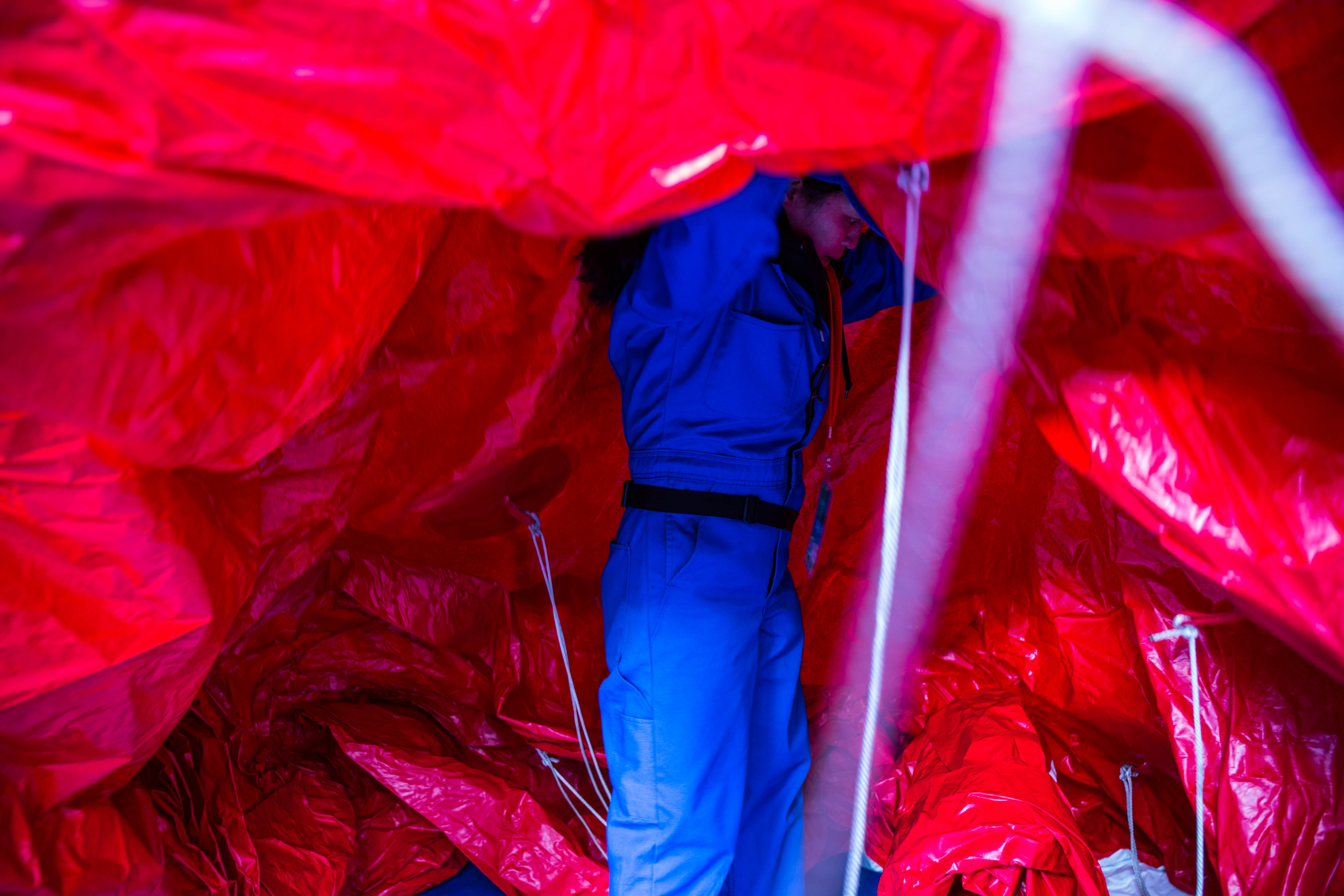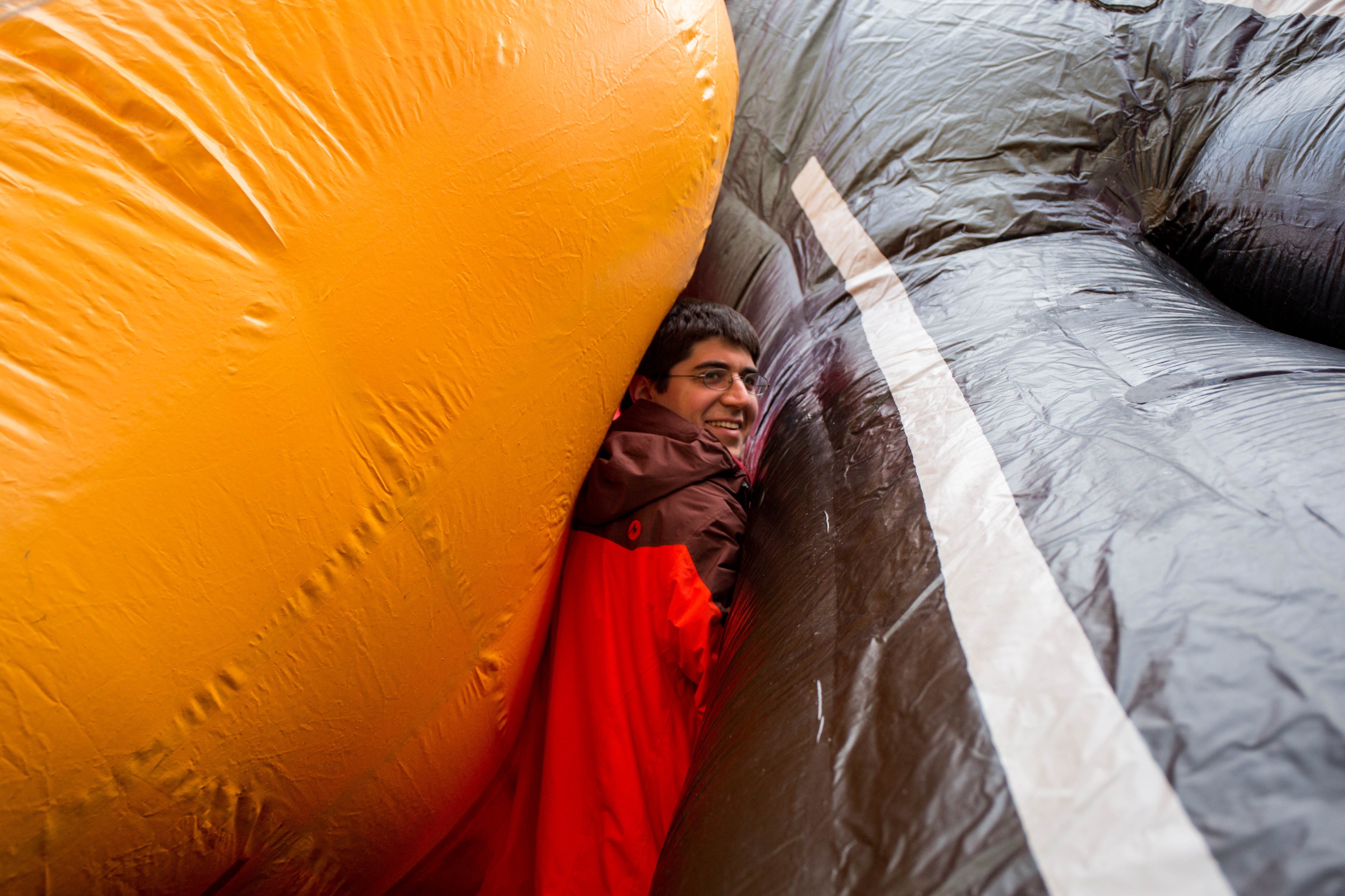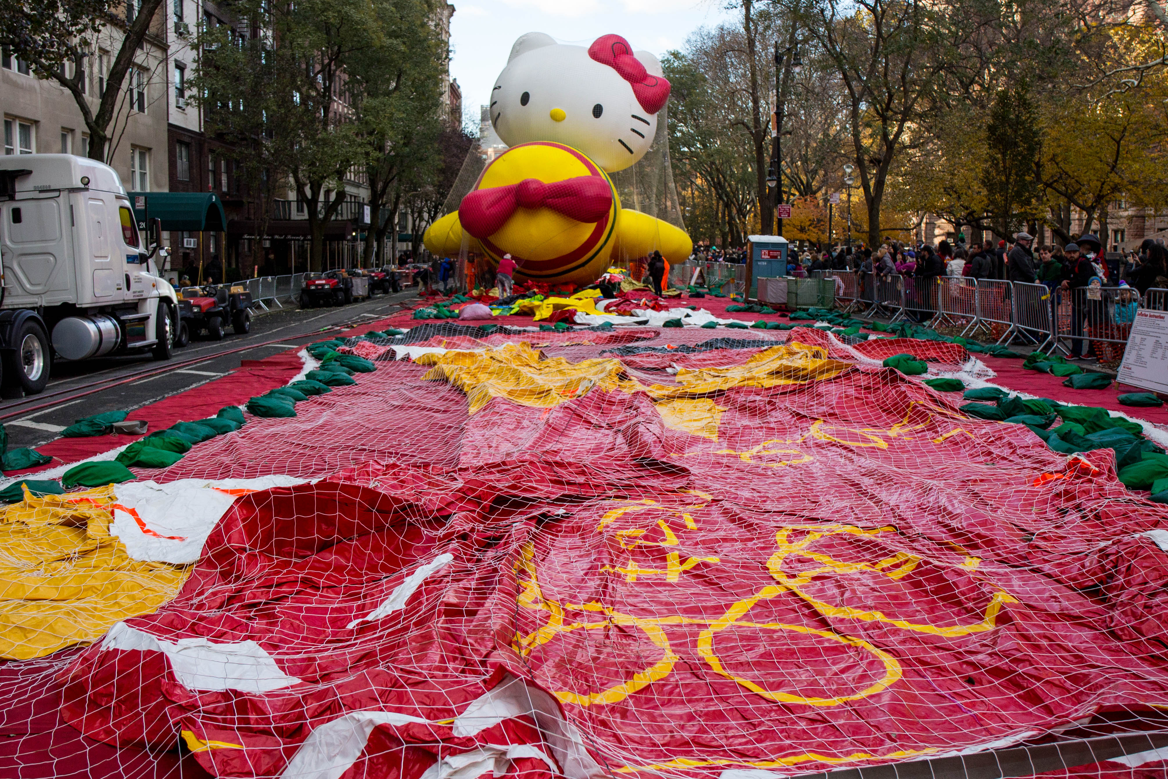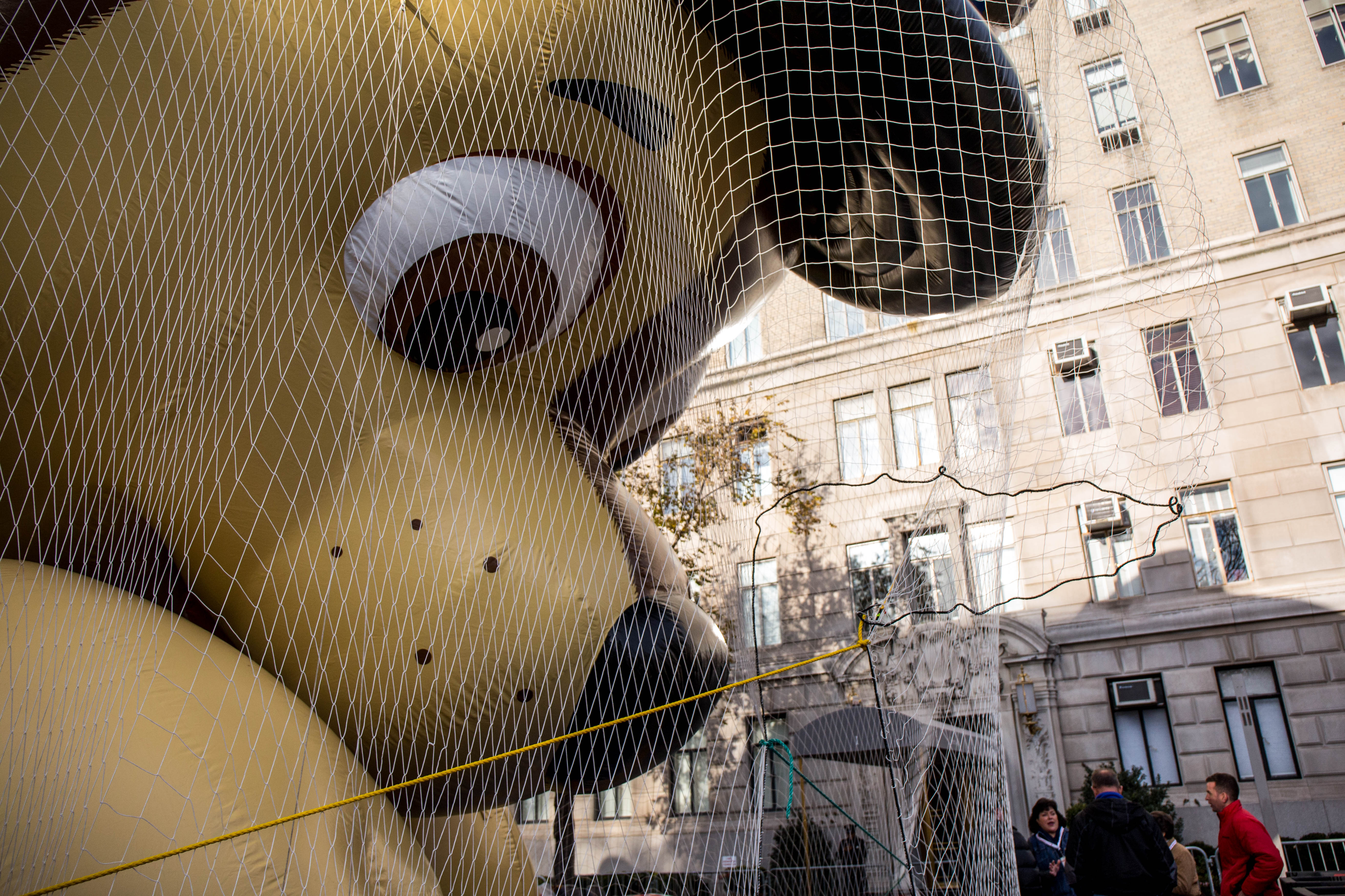 This is a huge undertaking. According to Macy’s Studio Vice President John Piper, the crew of more than a hundred inflation technicians spend all day laying out the balloons on West 77th and 81st Streets, and then blasting them full of helium from one of four gas-tank trailers. Empty, these monsters weigh between 400 and 700 pounds; once full that drops to around NEGATIVE 350 pounds.