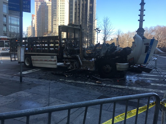 The burnt husk of the truck ?sat next to the Time Warner Center after FDNY put it out.