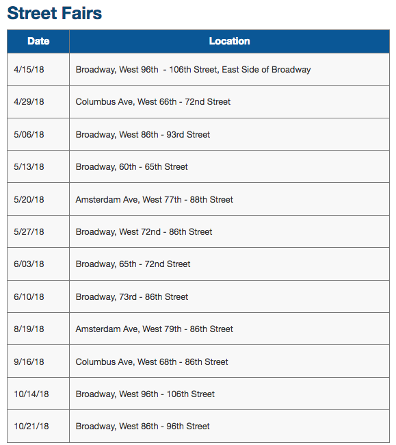 Hi! On June 9 there will be a street fair running from 96th to 106th on Columbus. Also- on Sept 16 & 23, Amsterdam Ave will be closed from 106th to 110th for Bloomingdale Family Days (free activities with music).