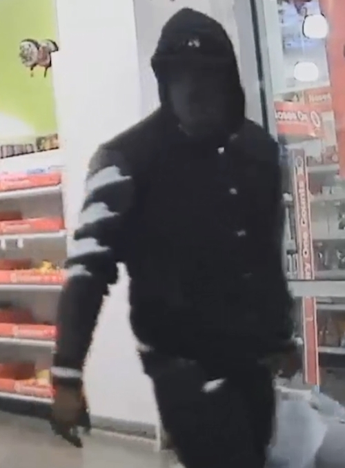 The first individual is described as a male with a mask over his face; last seen wearing a black hooded sweater, a black jacket with white stripes on its sleeves, black pants and black and gold sneakers.