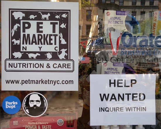 “As a small business, I hire people who can manage everything – interact with people well, give top-quality customer service, speak on the phone, handle stock, check deliveries off the truck and love animals,” says Sophia Angelakis, owner of Pet Market on 72nd between Broadway and West End Avenue. Her help wanted sign has brought in two new hires, but she’s always looking for more staff for all three of her locations. “As long as they can work legally and that they like what they’re doing,” she says, “I don’t care about age or specific experience. It’s more about personality. Experience they learn here.”