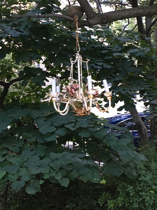 The elaborate lighting fixture was hanging from a tree in the park around 74th Street on Friday, said Mindy Forman, who snapped the photos above and below. “Always nice to sit on a park bench in Riverside Park with a touch of elegance…” she wrote.