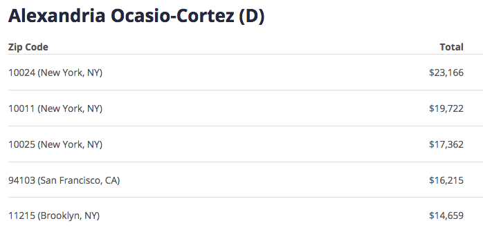 Because no neighborhood in the entire country was more generous to his boss’ campaign, according to data from opensecrets.org. The 10024 zip code gave Ocasio-Cortez $23,166 in the last election cycle, the most of any zip code in the country. The 10025 zip code gave the third-most, at $17,362. The 10023 zip was in eighth place, at $10,397.