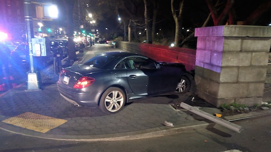 “A Mercedes Benz with DC plates crashed into the wall of the park causing serious damage to the front of the car,” our tipster wrote. “You can see the pole with the pedestrian crossing button knocked down.”