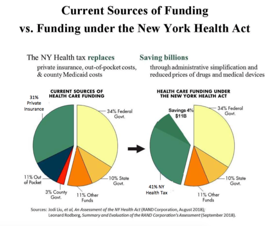 The New York Health Act would transform health care in the state, so that it would be paid for by government sources, including state and federal tax dollars and new payroll taxes. It would eliminate premiums, deductibles, co-pays and out-of-network charges.