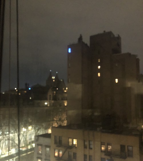 “In January, my boyfriend and I moved into 101 West 79th street (the huge building on the corner of 79 and Columbus). We absolutely love the building and the block, but are totally baffled by the building across the street from us. Each evening, one of the top floor windows is illuminated bright blue (see photo attached). Pre-daylight savings time the light turned off around 9:03, now it goes off around 10:03. Same time every night. Our living room and bedroom look straight out at the light, so pretty much every evening we debate its purpose, even more so in this time when we’re confined to our homes. We have also recently learned that other long-time residents of the building are curious as well — referring to it as ‘the blue light.'”