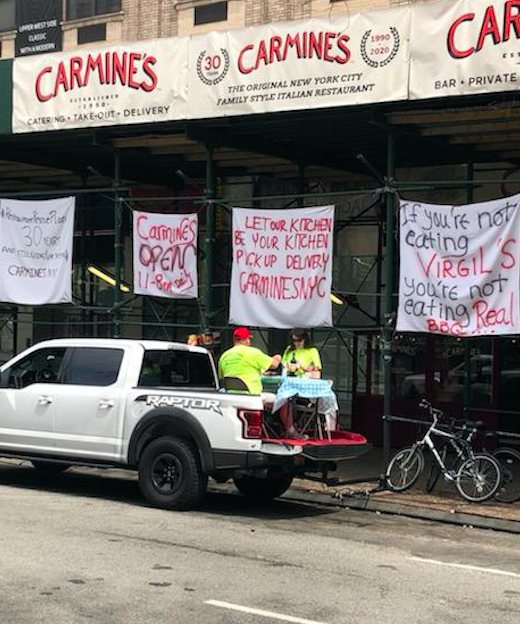 Restaurants can’t serve sit down meals, but that doesn’t mean you can’t park your pickup truck outside and set up a tablecloth lunch with your significant other. This man ordered a meal from Carmine’s at 2450 Broadway (90th-91st) and ate it al fresco on a nice day.