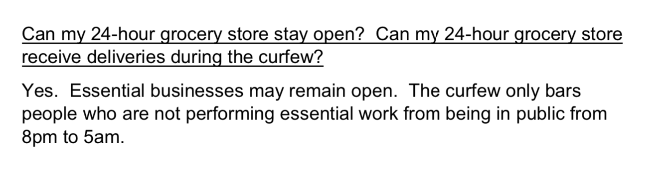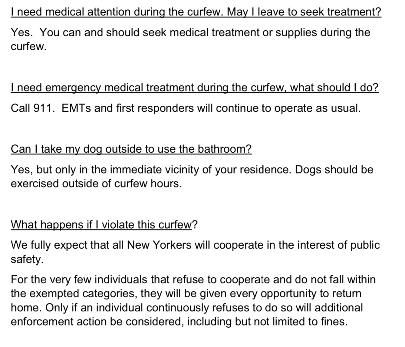 The curfew has various exceptions, including for essential workers and for food deliveries. The Manhattan Borough President’s office released some answers to frequently asked questions that you can access here, and we’ve pasted images of it below.